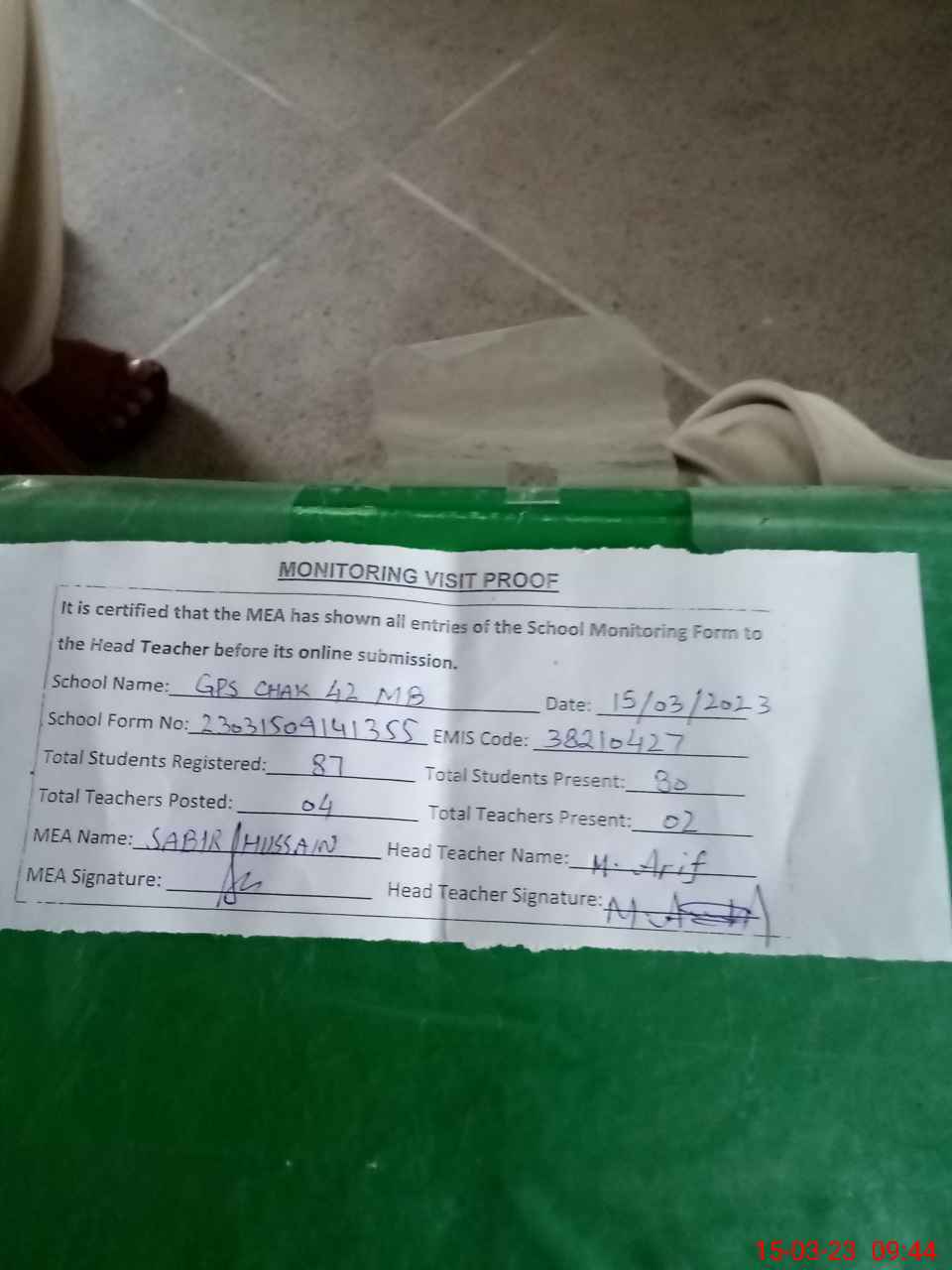 | Attendance Register | Head Teacher | MEA with School | Visit Proof |
