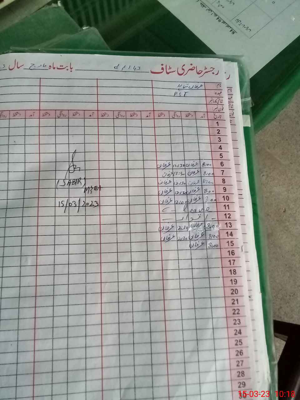 | CNIC | Full Name | Designation | R/C | Absence During Last Calender Month |