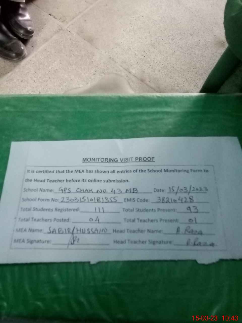 | EMIS Code: 38210428 | Name of School: GPS CHAK NO. 43 MB | |||