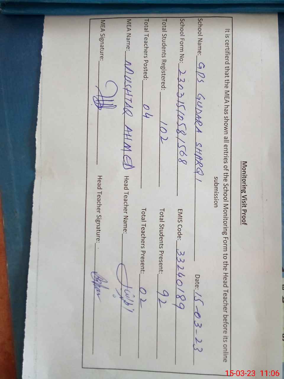 | Attendance Register | Head Teacher | MEA with School | Visit Proof |