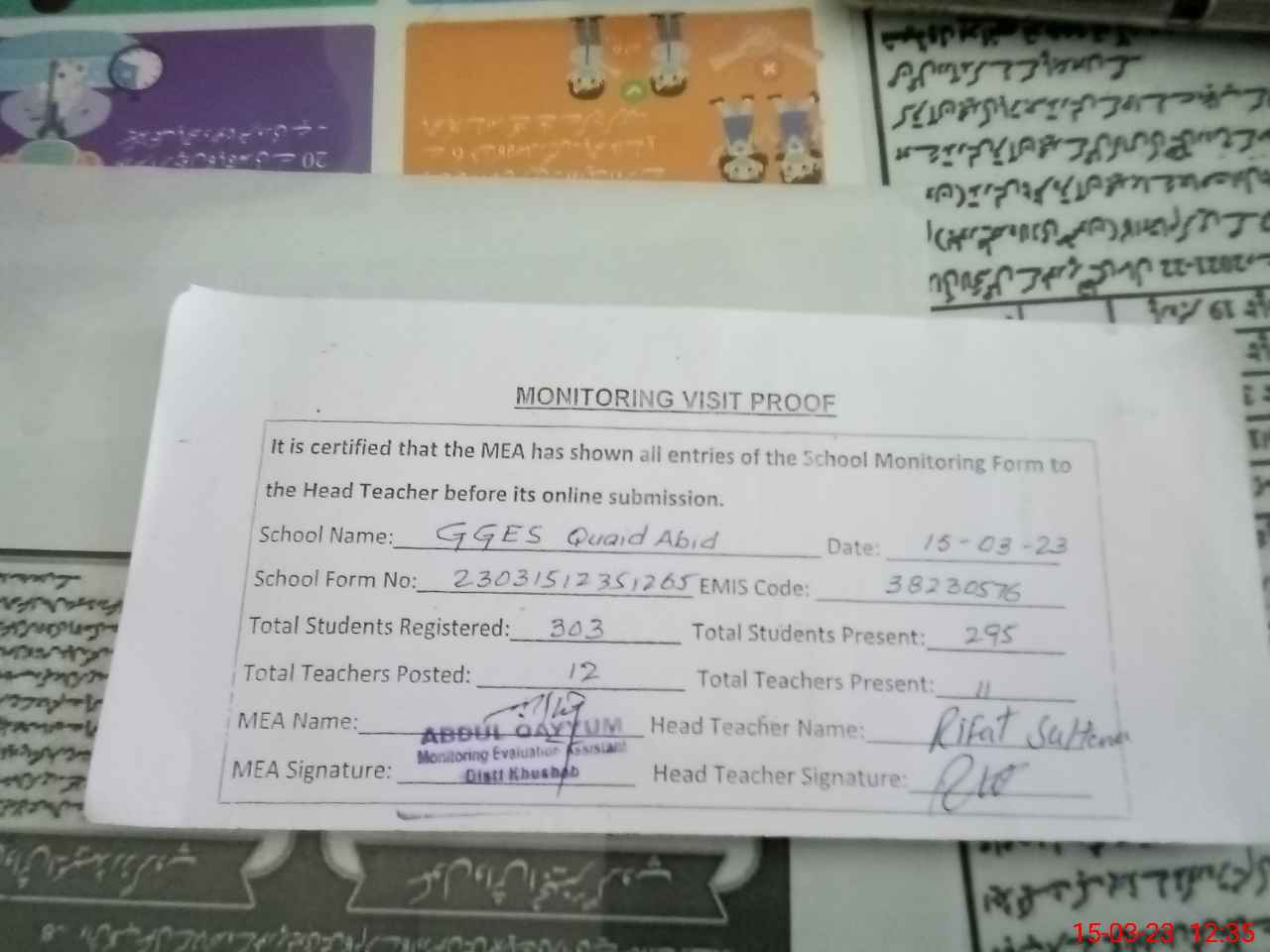 | Attendance Register | Head Teacher | MEA with School | Visit Proof |