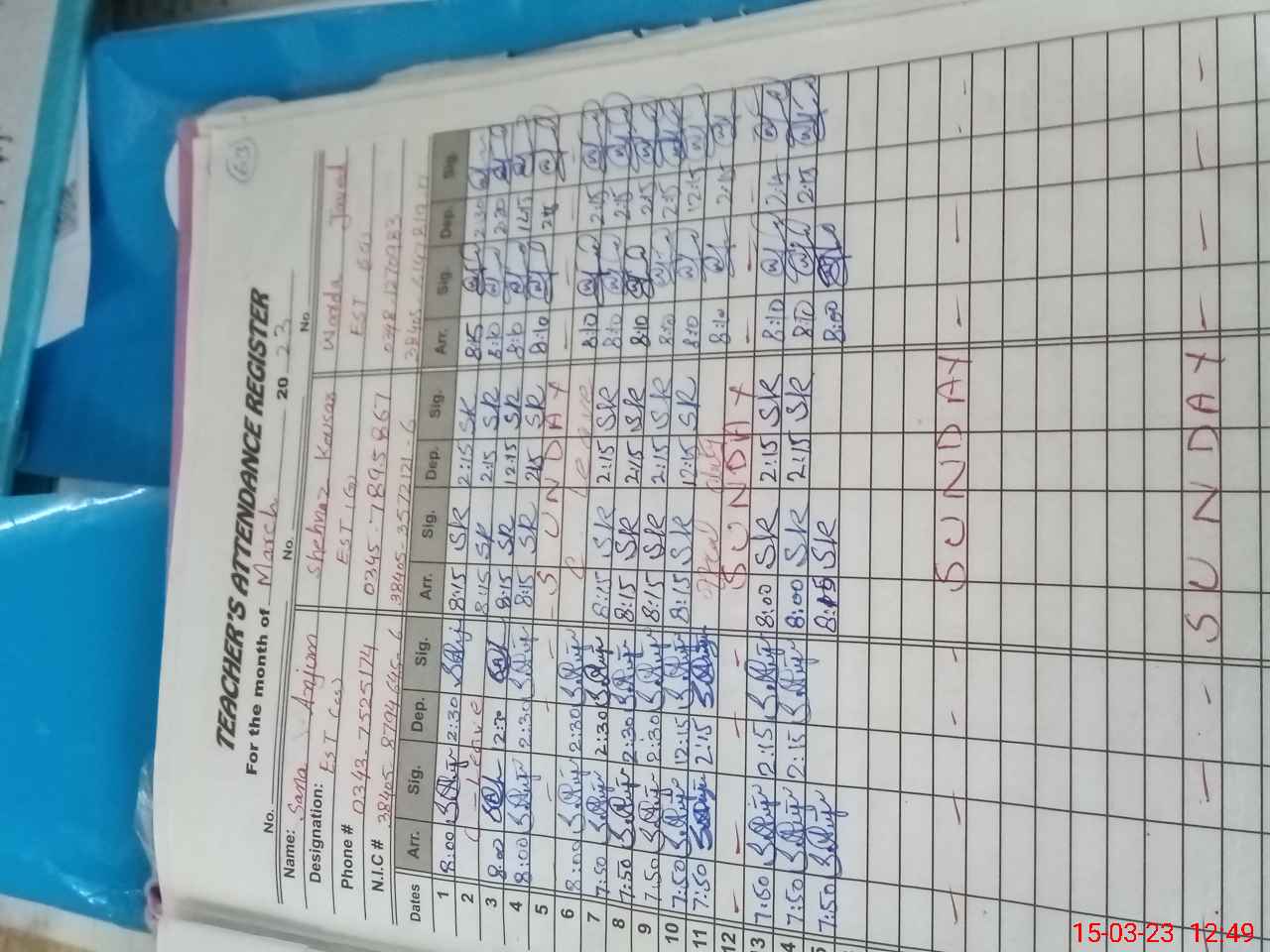 | Name: Sa**** Na**** Designation: (School Headmaster's/Headmistress's) SST Sci Phone/Cell Number: 03**** |