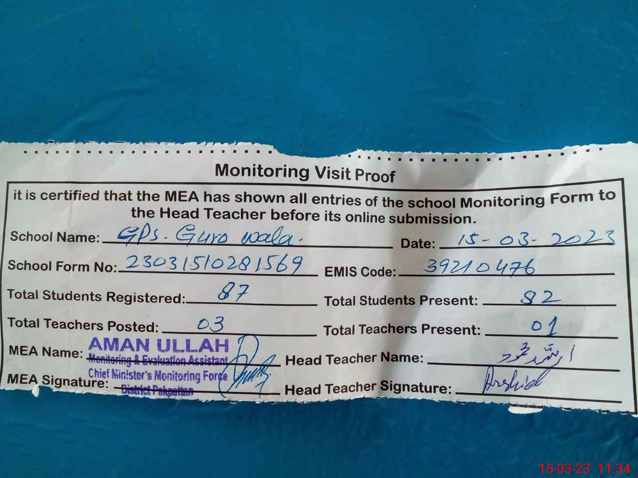 | Attendance Register | Head Teacher | MEA with School | Visit Proof |