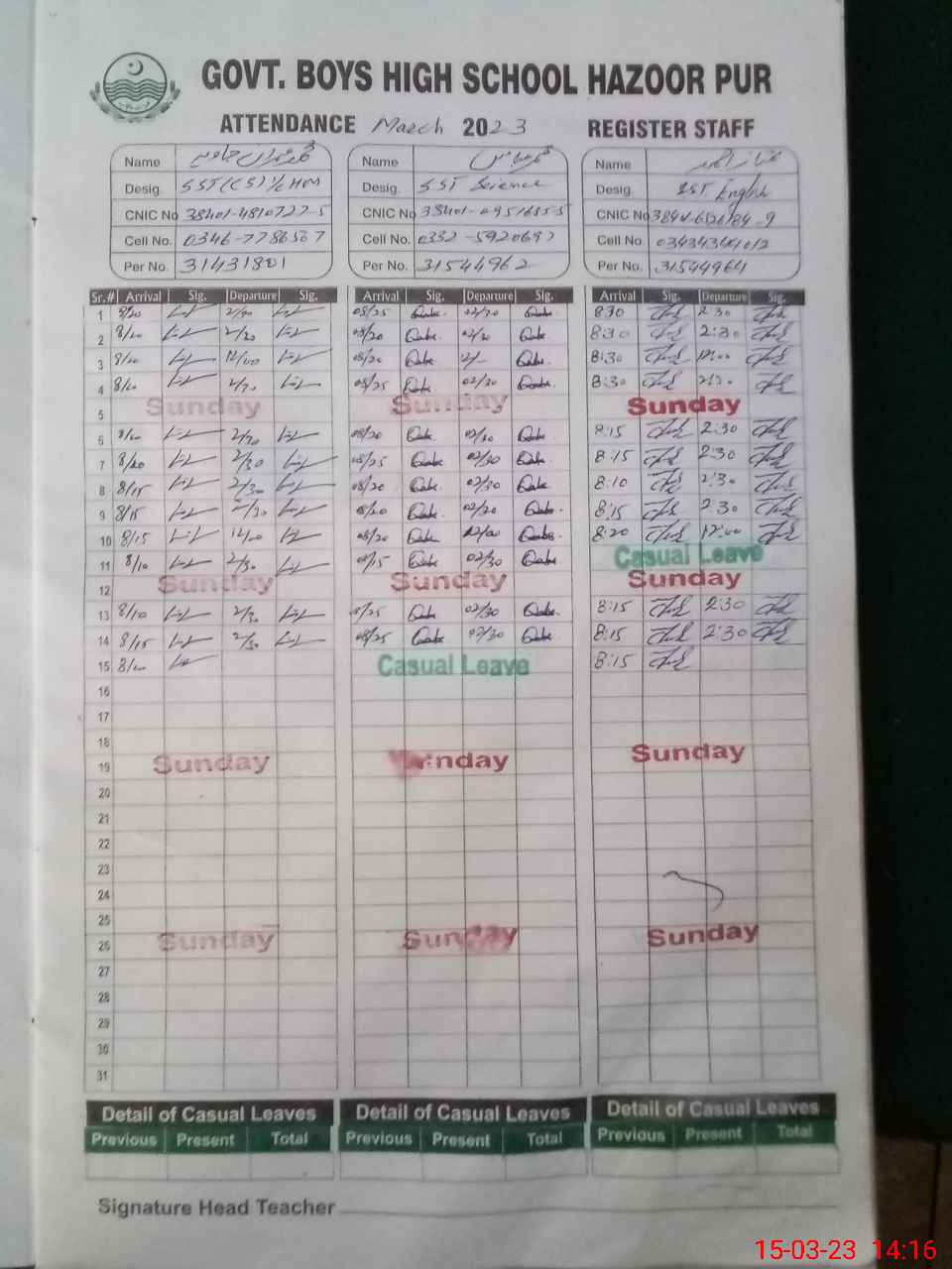| CNIC | Full Name | Designation | R/C | Absence During Last Calender Month |