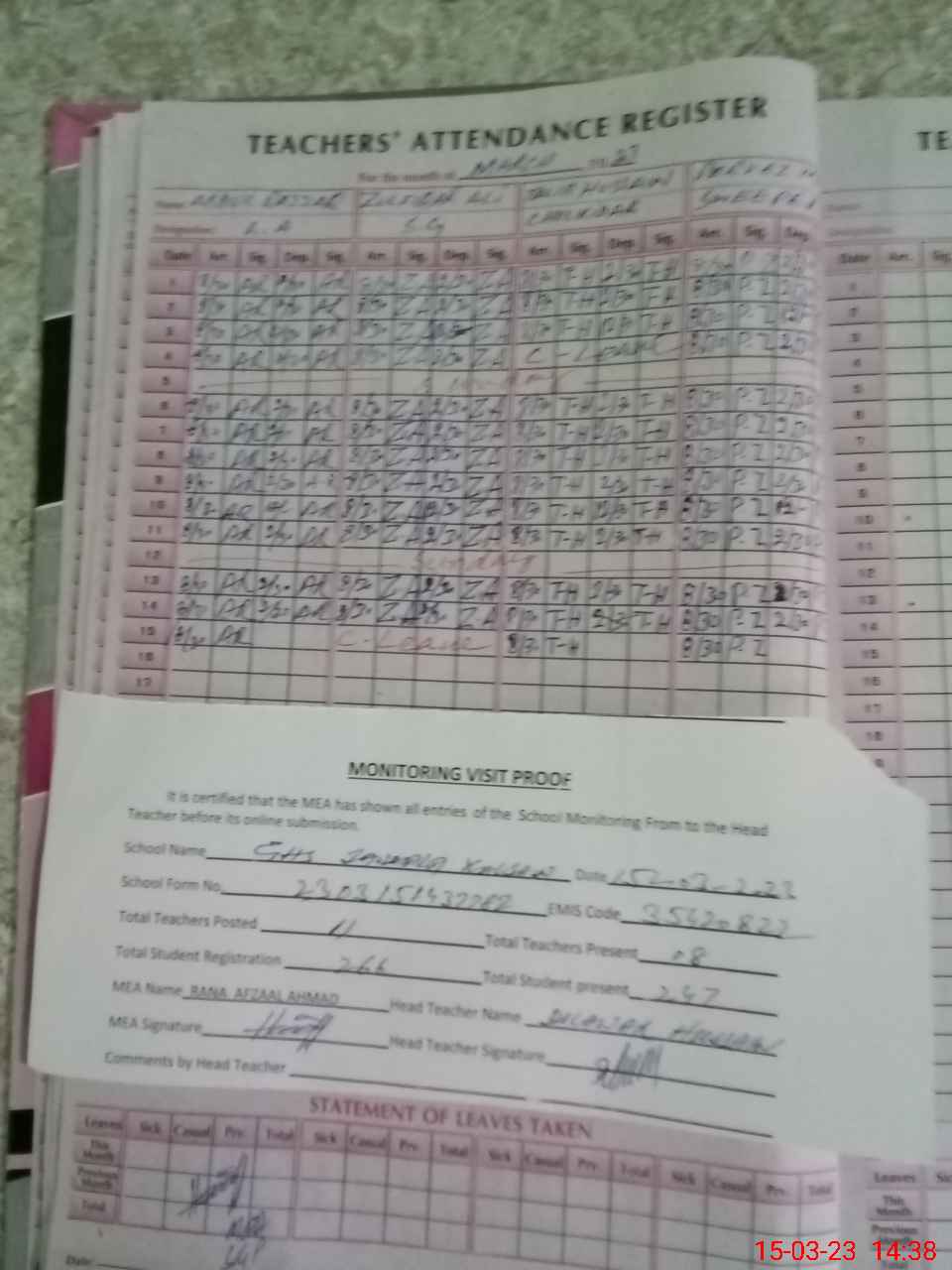 | Attendance Register | Head Teacher | MEA with School | Visit Proof |