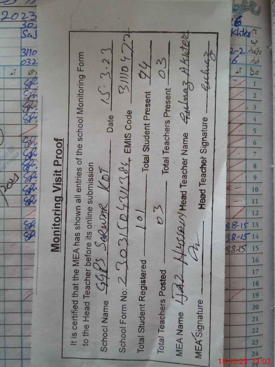 | EMIS Code: 31110472 | Name of School: GGPS SARWER KOT | |||