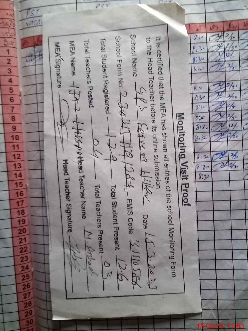 | Attendance Register | Head Teacher | MEA with School | Visit Proof |