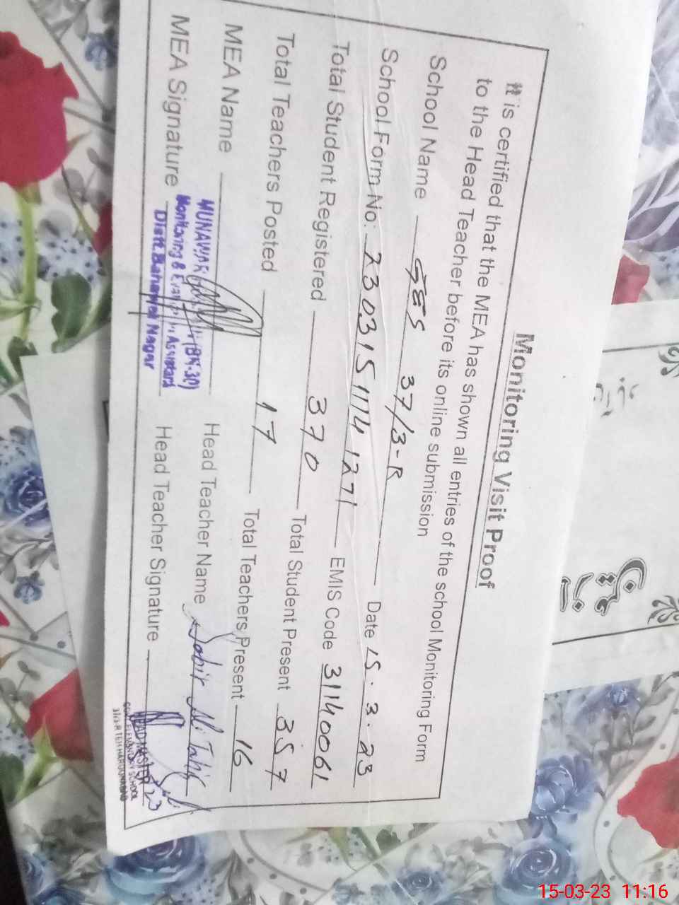 | Attendance Register | Head Teacher | MEA with School | Visit Proof |