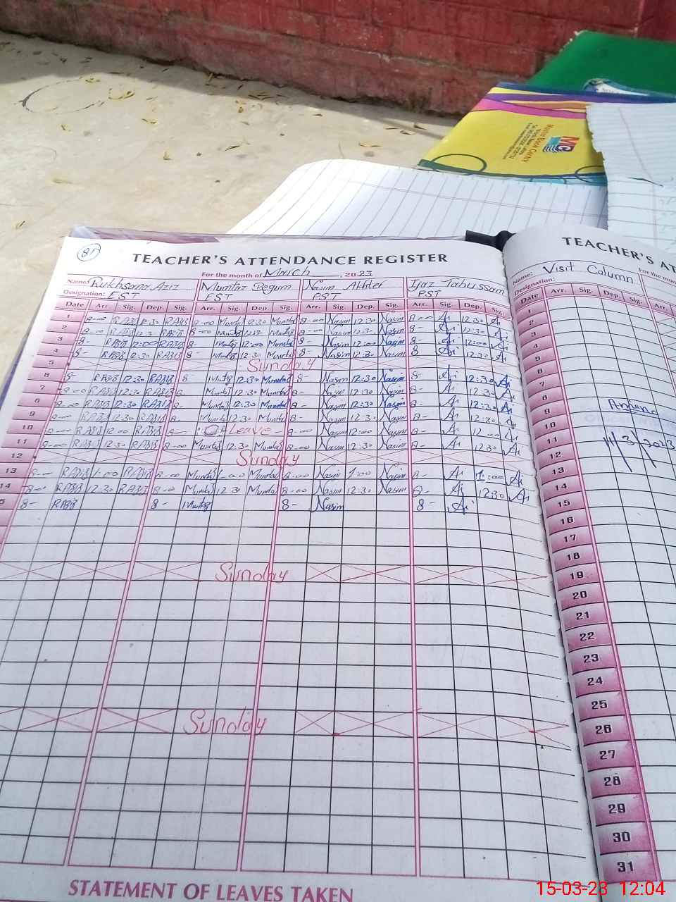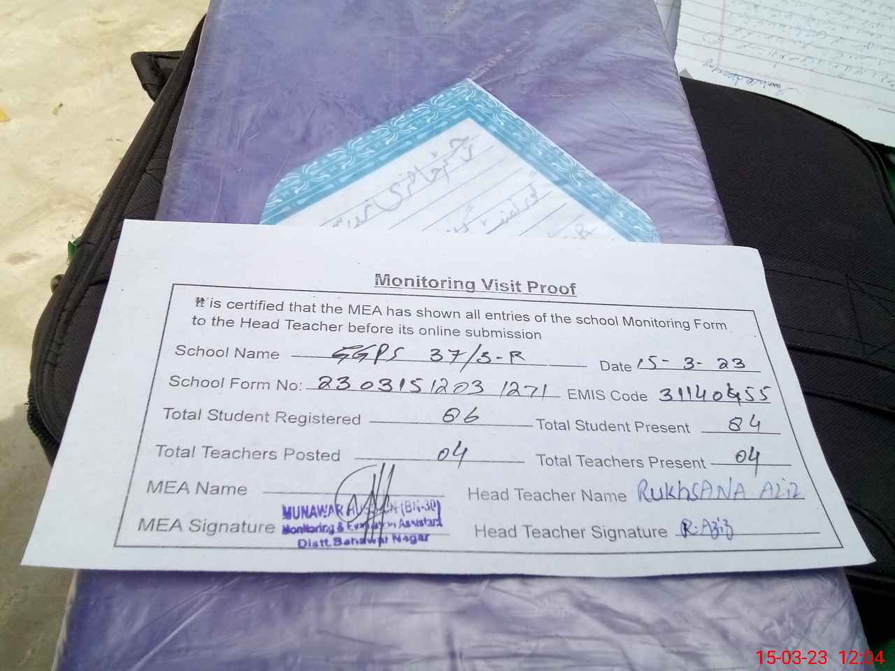 | Attendance Register | Head Teacher | MEA with School | Visit Proof |