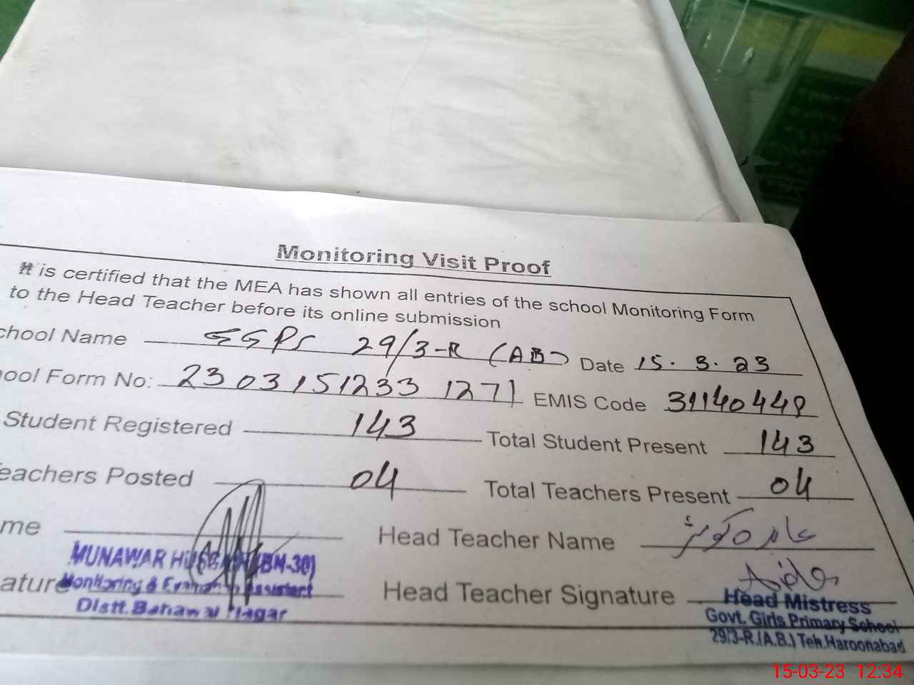 | Attendance Register | Head Teacher | MEA with School | Visit Proof |