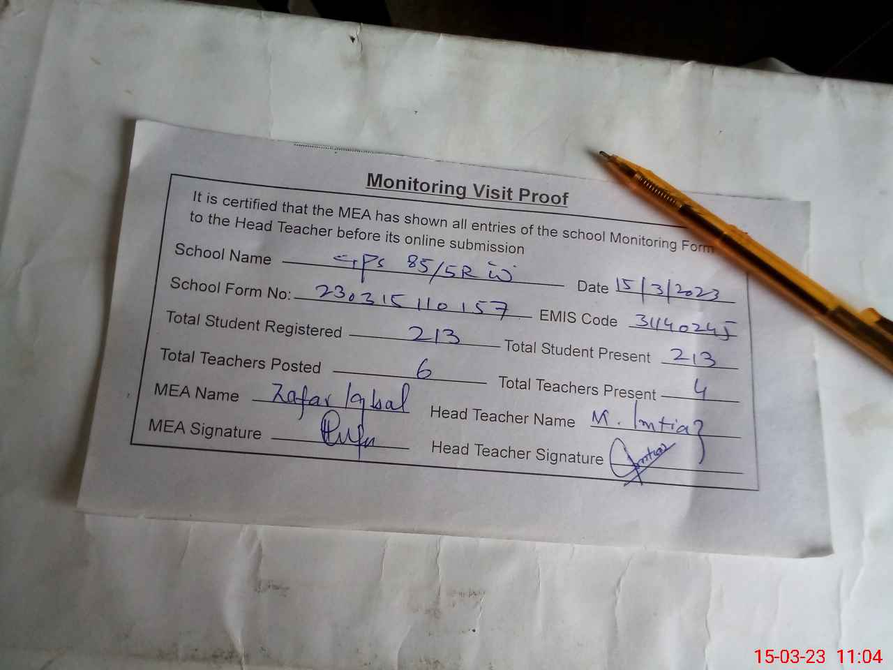 | Attendance Register | Head Teacher | MEA with School | Visit Proof |