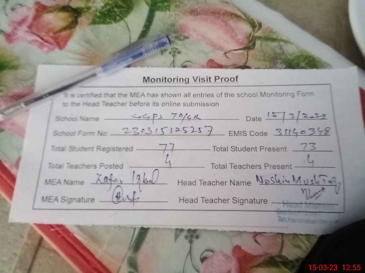 | Attendance Register | Head Teacher | MEA with School | Visit Proof |