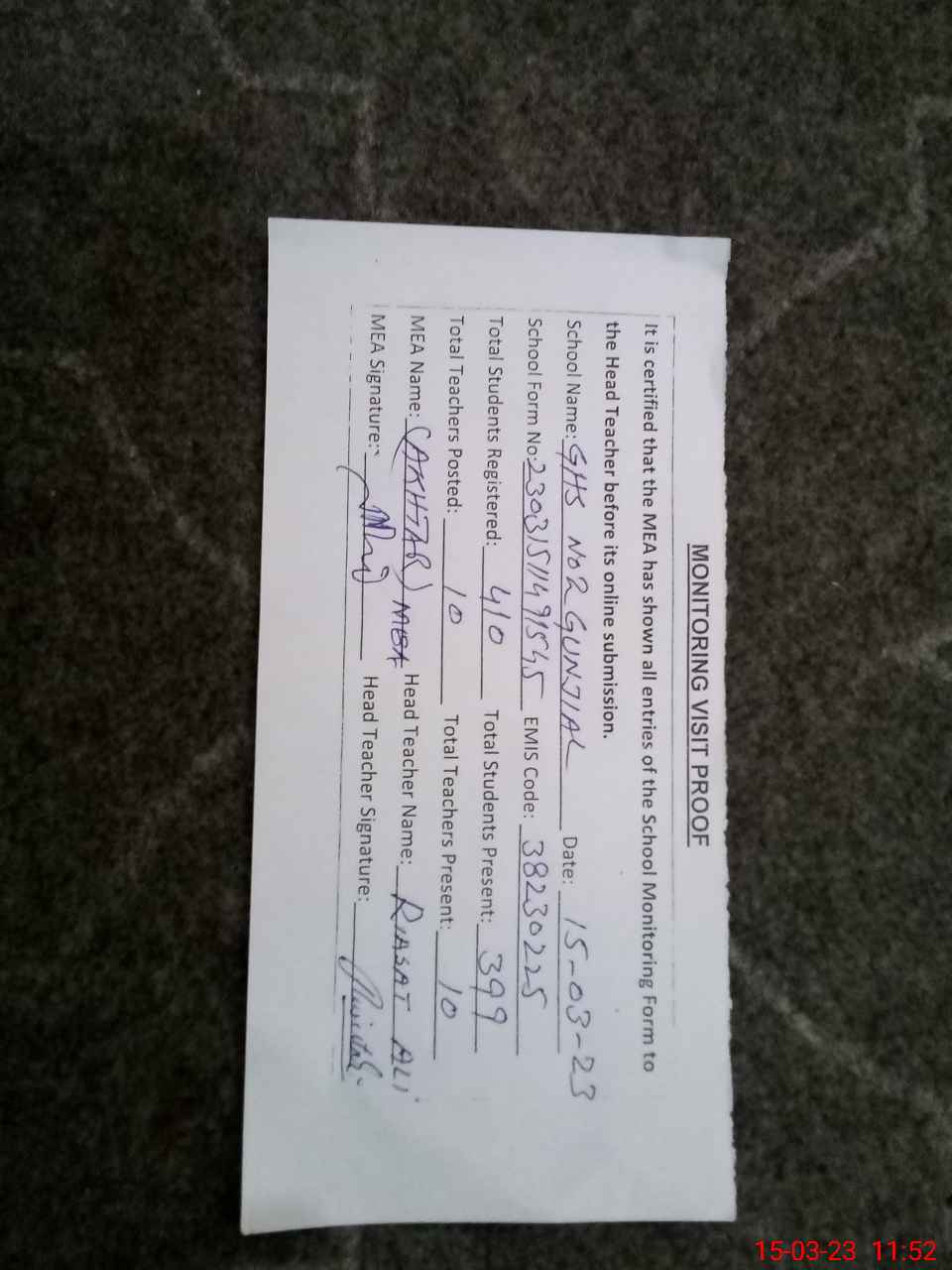 | Certified that this School was Inspected by the Undersigned MEA/DMO Today and the Information Stated Above is as Per Record. | |||||