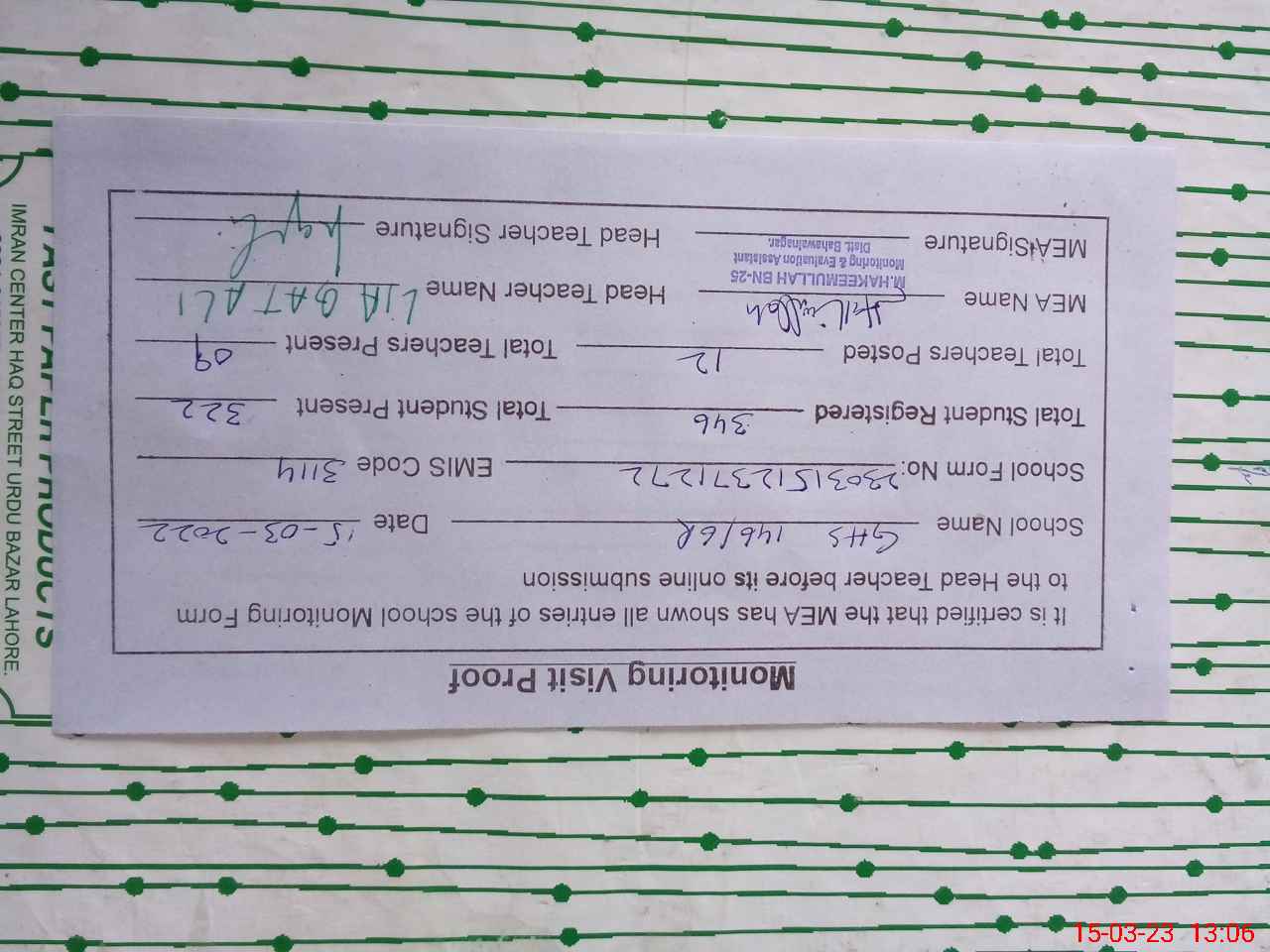 | Monitoring Date: 15-03-2023 | Start Time: 15-03-2023 12:13 PM | End Time: 15-03-2023 01:08 PM | Name of MEA: Mu**** ha**** ul**** BN25 | |