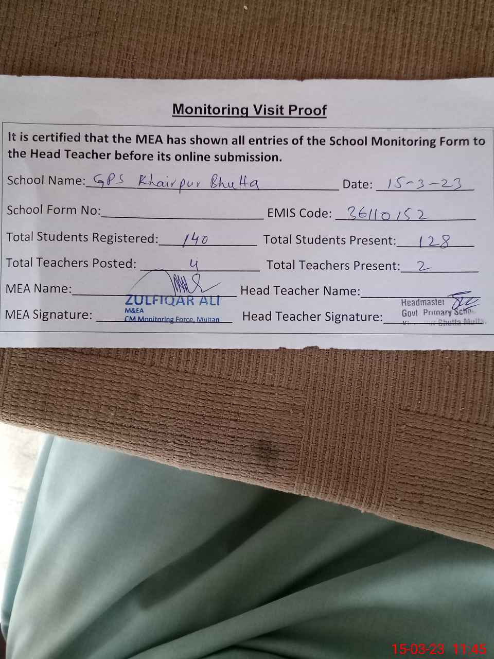 | Attendance Register | Head Teacher | MEA with School | Visit Proof |