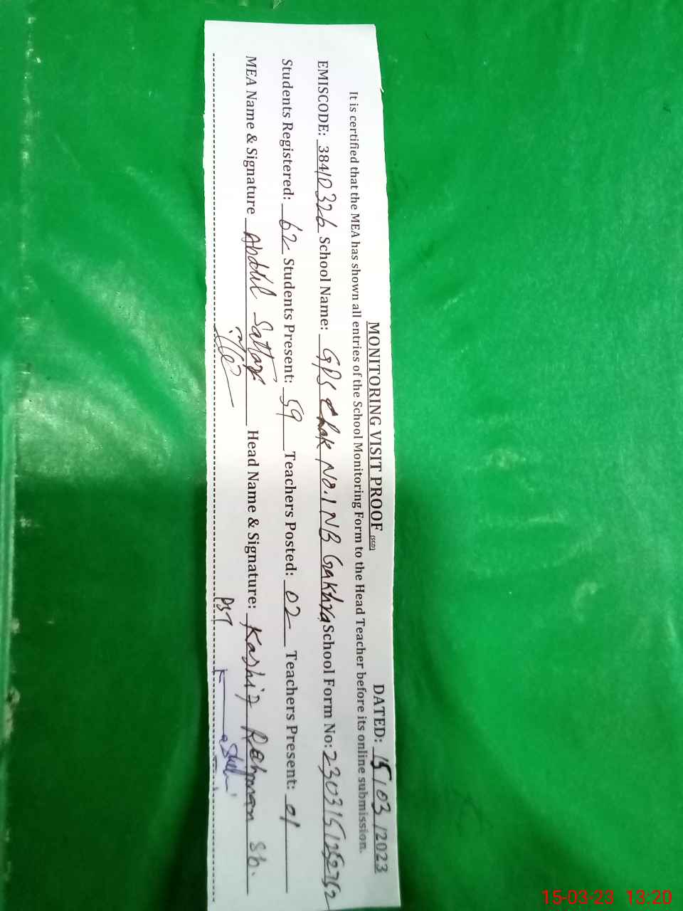 | Attendance Register | Head Teacher | MEA with School | Visit Proof |