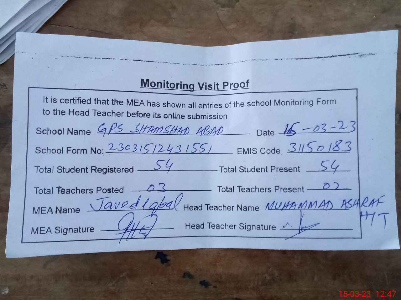 | Attendance Register | Head Teacher | MEA with School | Visit Proof |