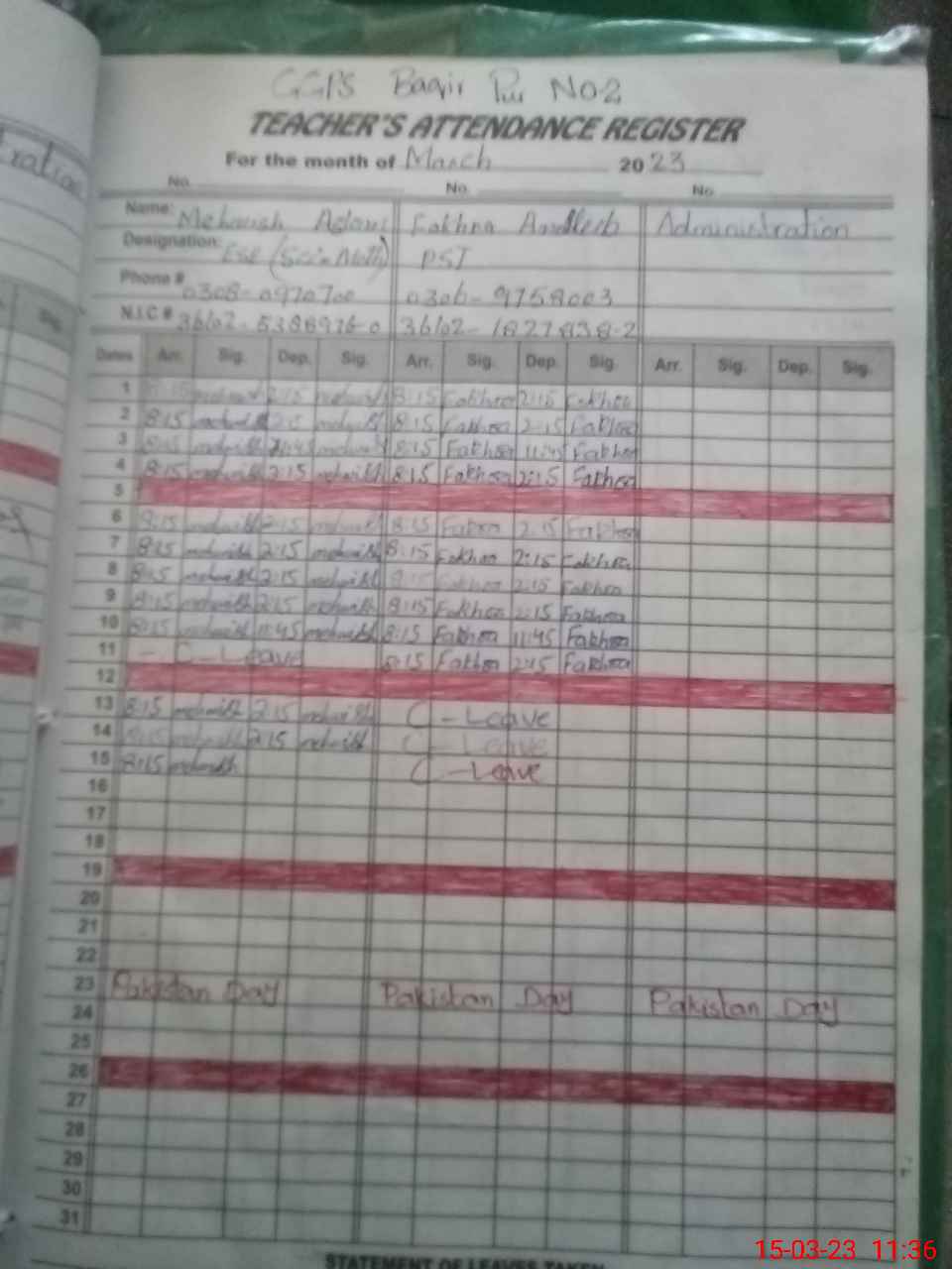 | CNIC | Full Name | Designation | R/C | Absence During Last Calender Month |