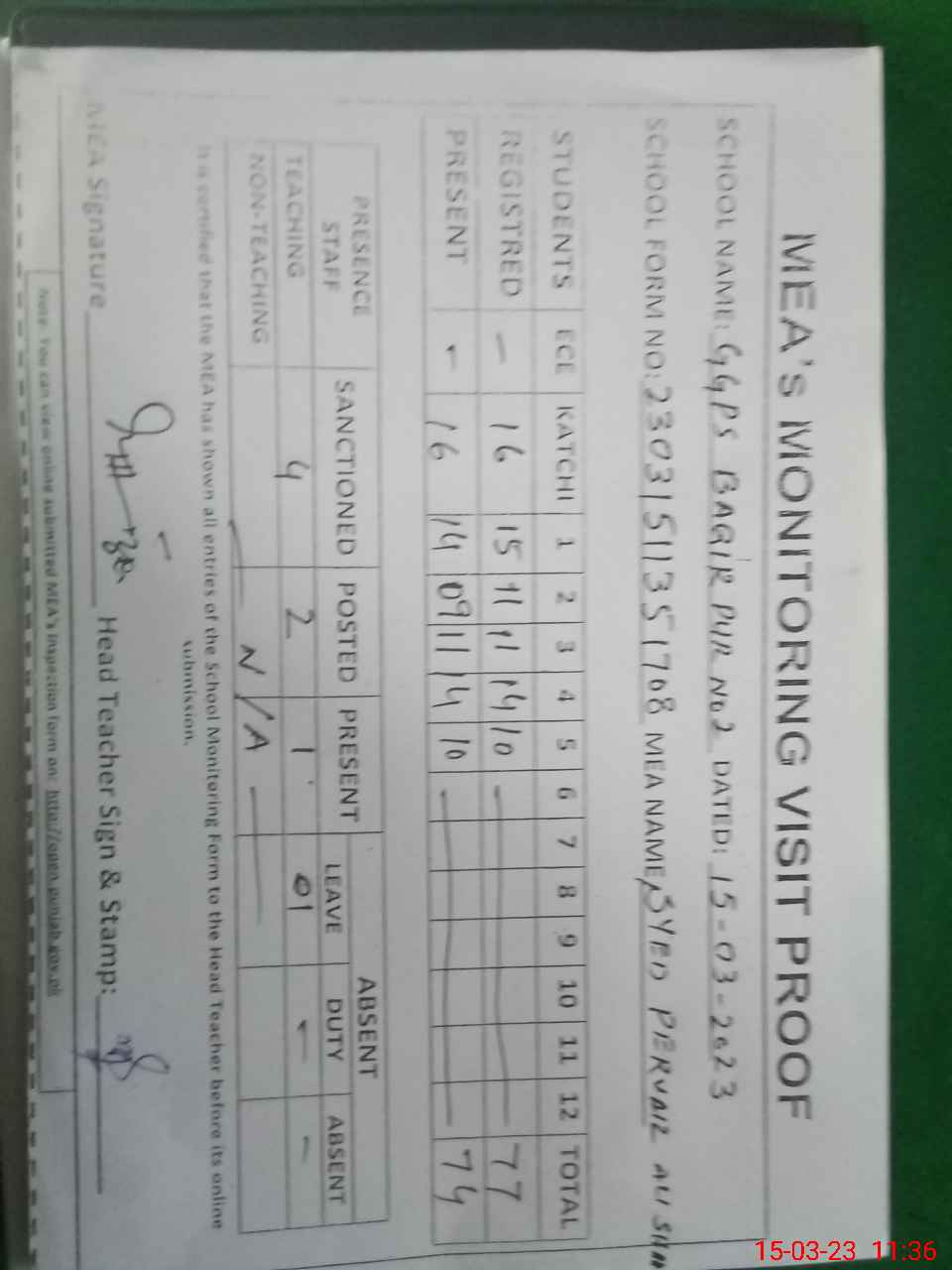 | Attendance Register | Head Teacher | MEA with School | Visit Proof |