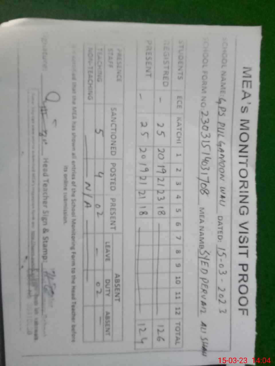 | Attendance Register | Head Teacher | MEA with School | Visit Proof |