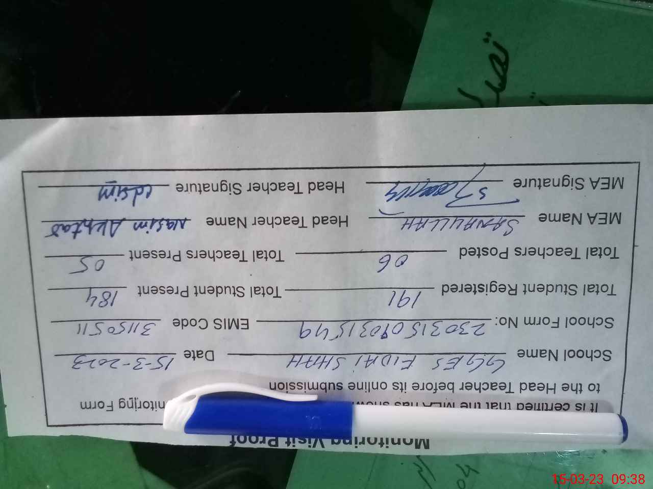 | Name: If**** Na**** Designation: (School Headmaster's/Headmistress's) SST Phone/Cell Number: 03**** |