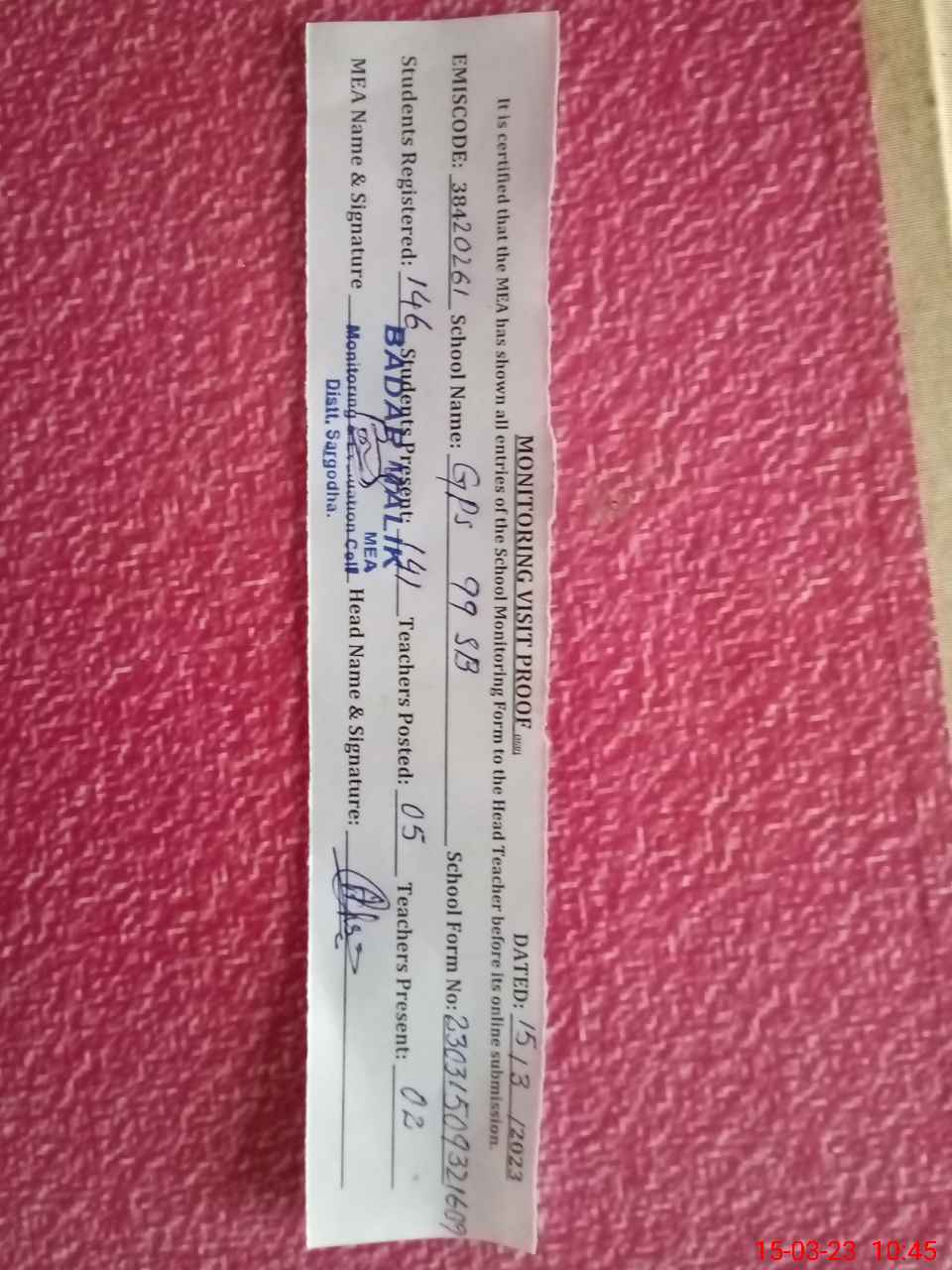 | EMIS Code: 38420261 | Name of School: GPS CHAK NO.99 SB | |||