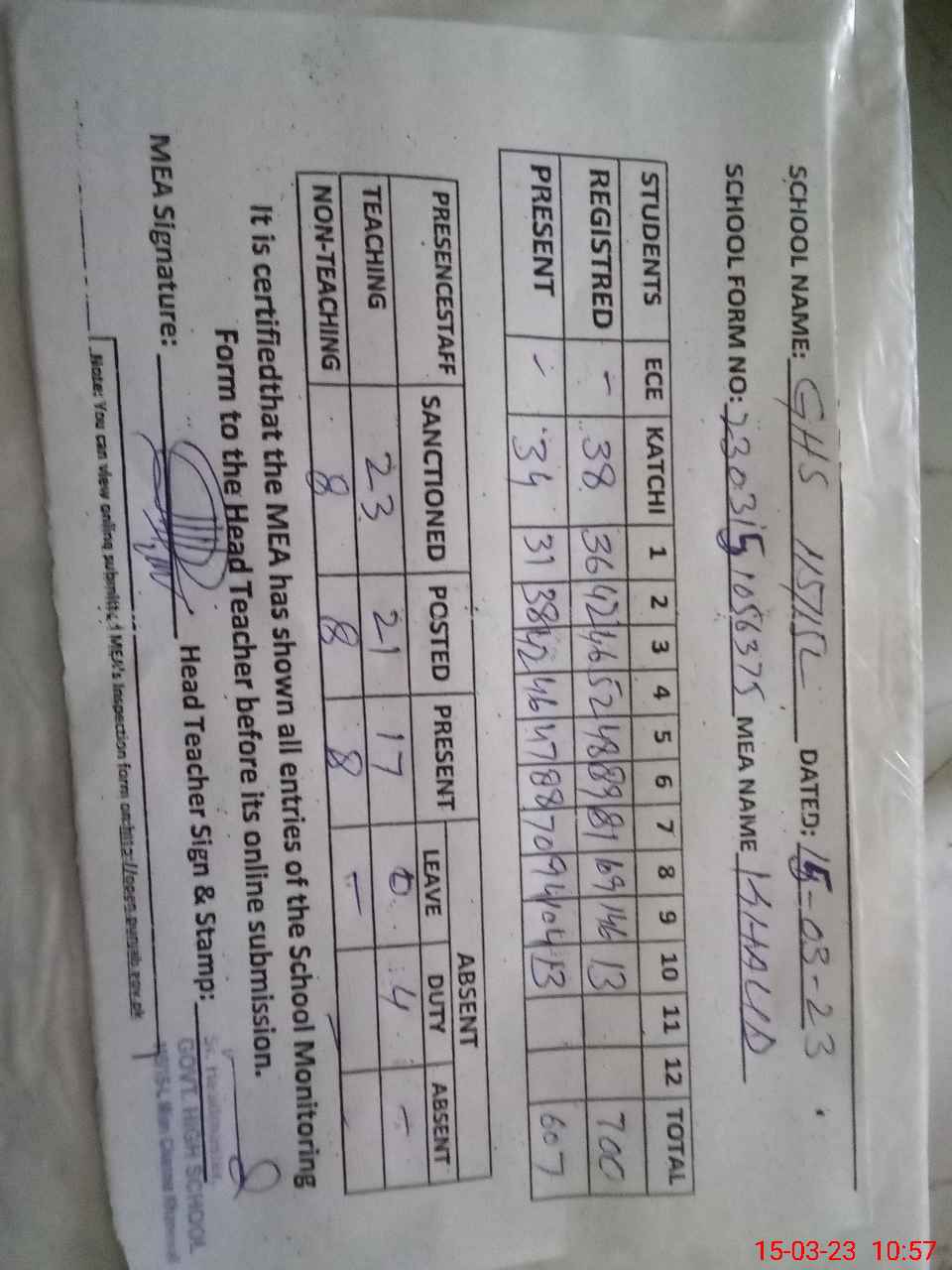 | Attendance Register | Head Teacher | MEA with School | Visit Proof |