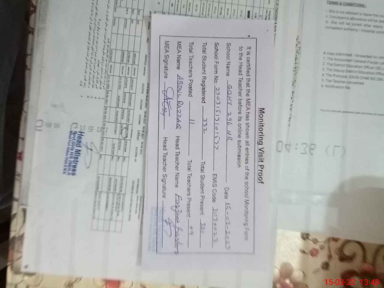 | Attendance Register | Head Teacher | MEA with School | Visit Proof |