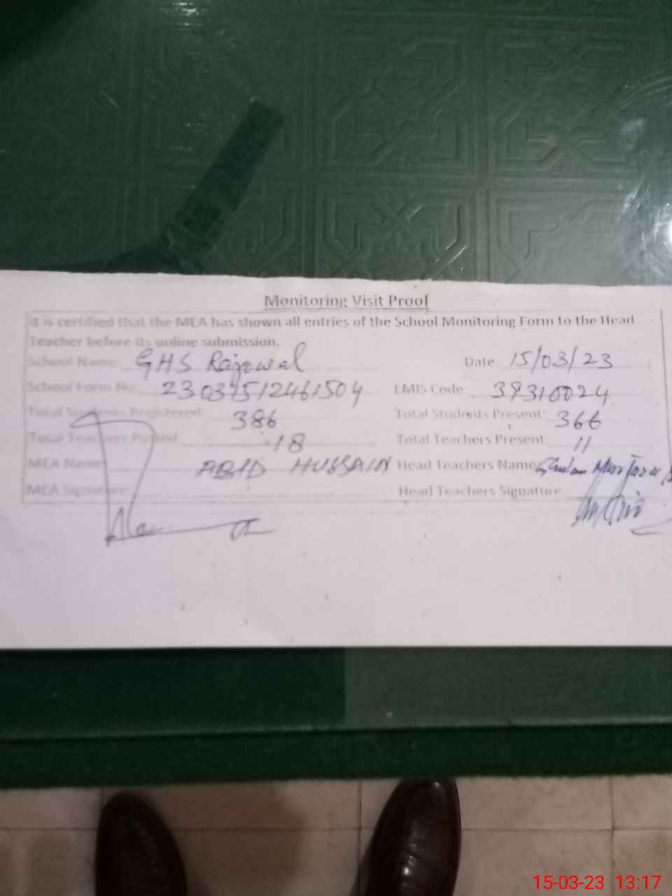 | Attendance Register | Head Teacher | MEA with School | Visit Proof |