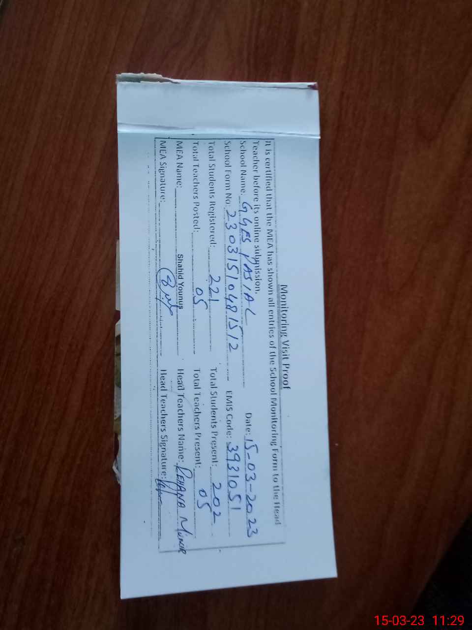 | Monitoring Date: 15-03-2023 | Start Time: 15-03-2023 10:42 AM | End Time: 15-03-2023 11:29 AM | Name of MEA: SH**** YO**** | |