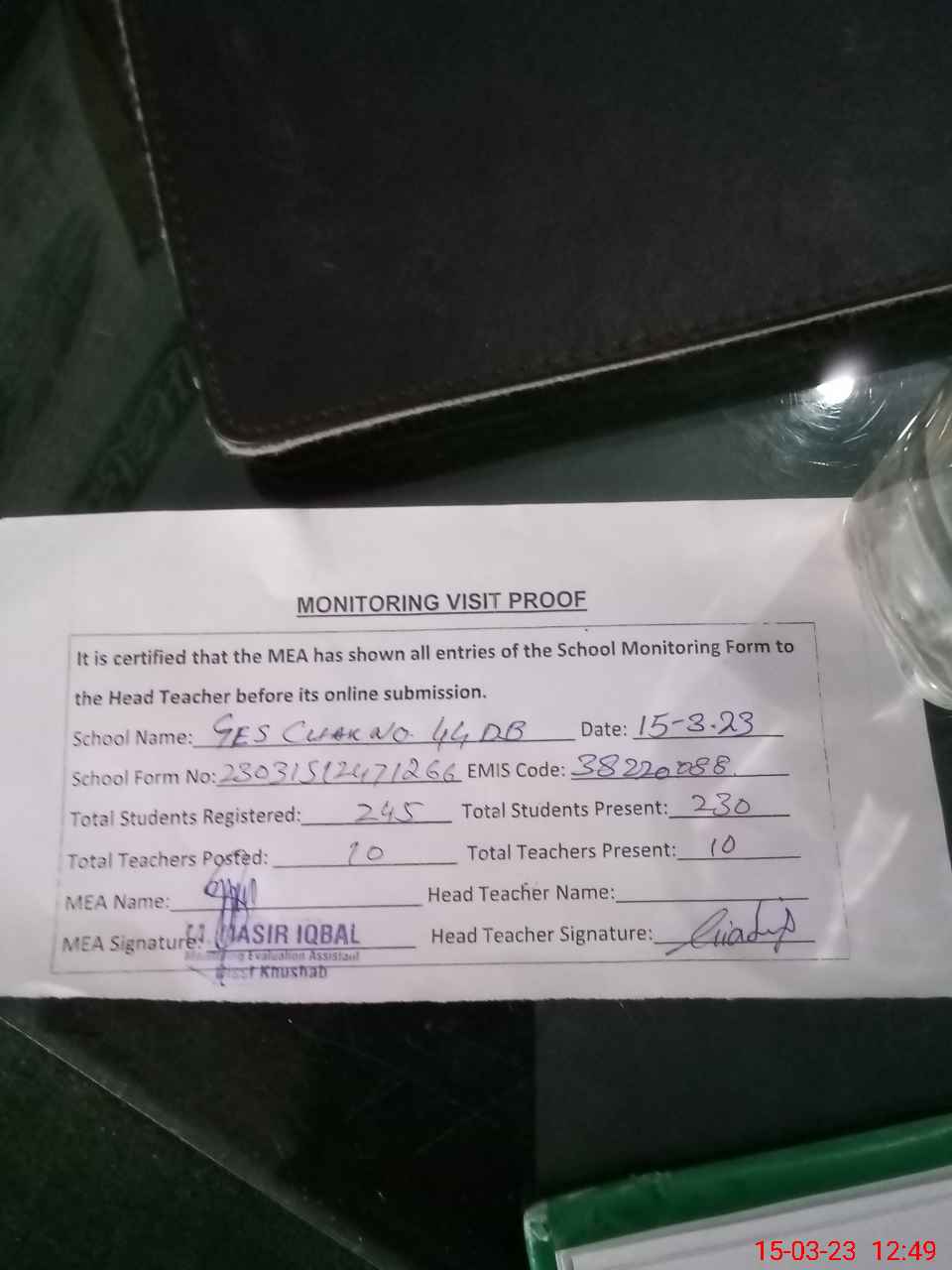 | EMIS Code: 38220088 | Name of School: GES CHAK NO. 44/DB | |||
