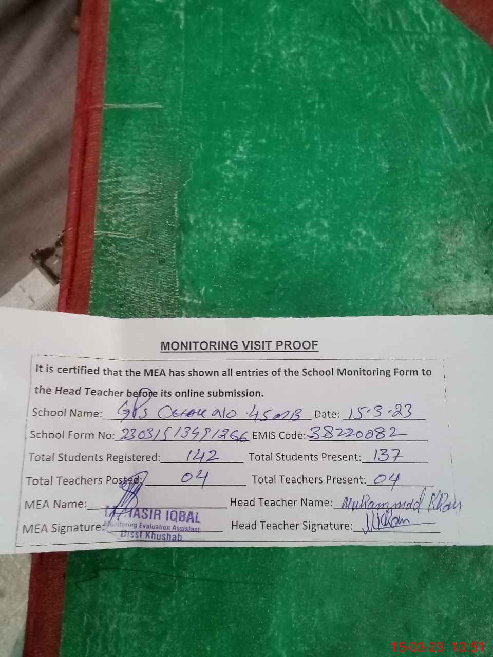 | EMIS Code: 38220082 | Name of School: GPS CHAK NO. 45/DB | |||