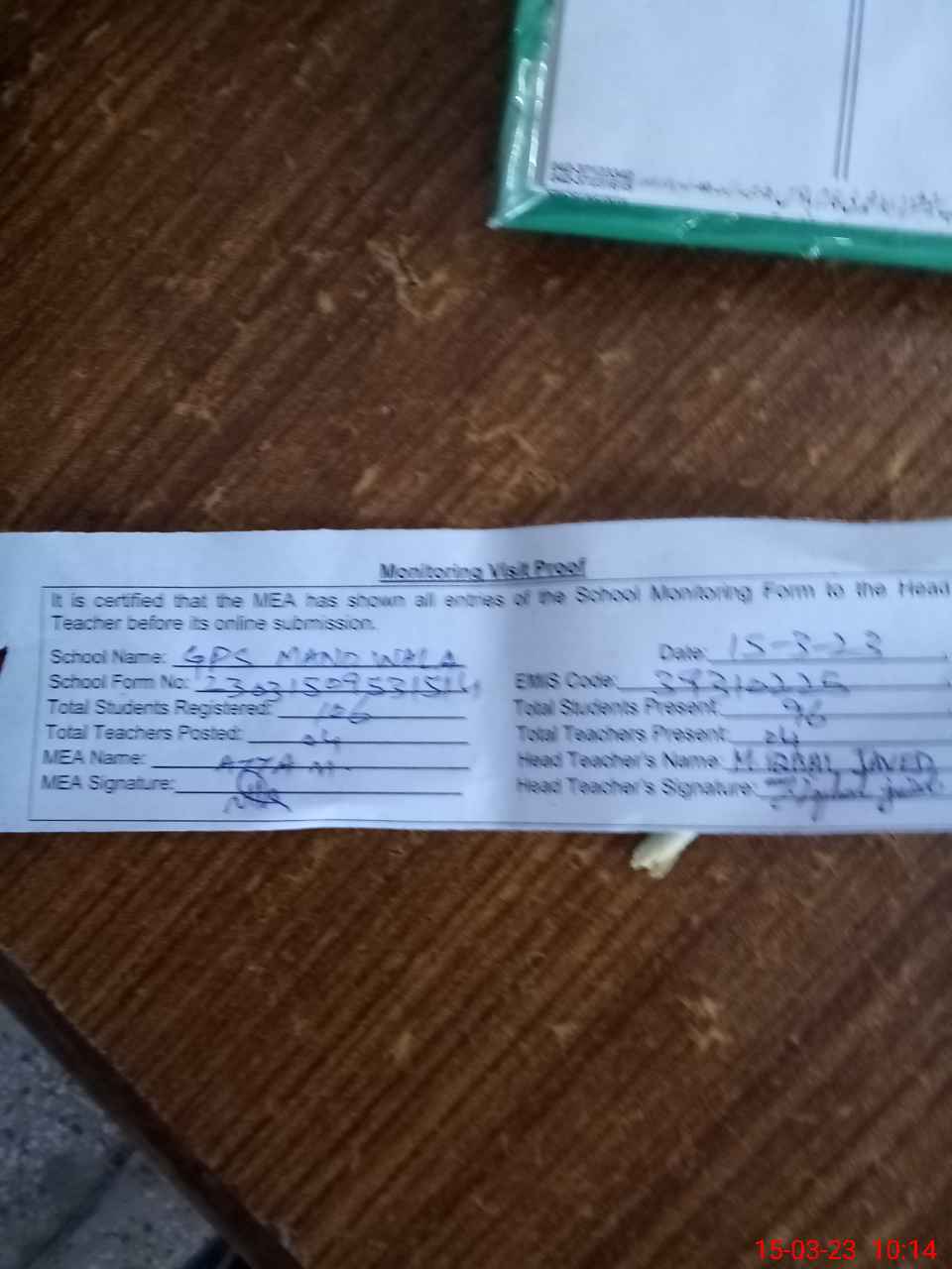 | EMIS Code: 39310225 | Name of School: GPS MANO WALA | |||