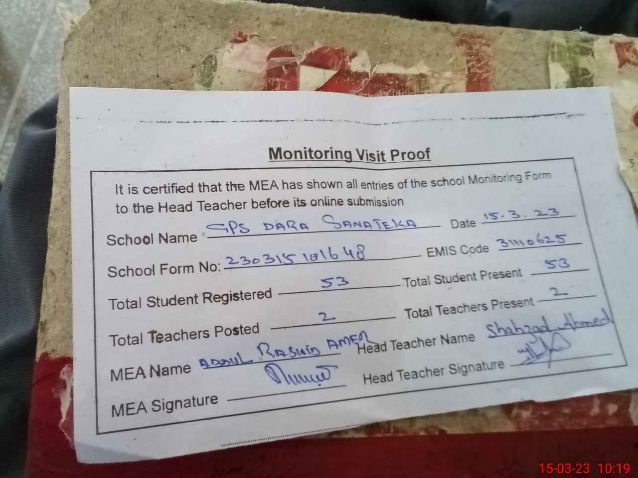 | Attendance Register | Head Teacher | MEA with School | Visit Proof |