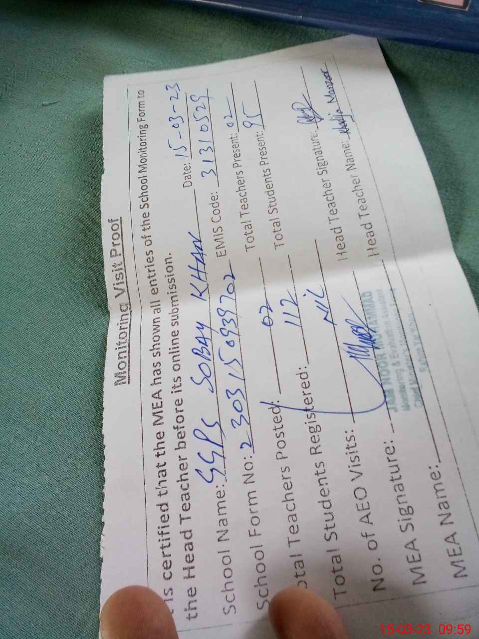 | Attendance Register | Head Teacher | MEA with School | Visit Proof |