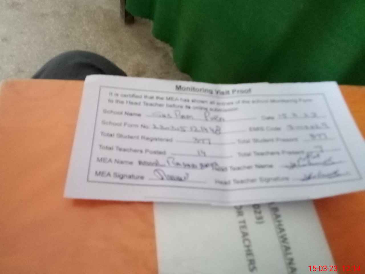 | Attendance Register | Head Teacher | MEA with School | Visit Proof |