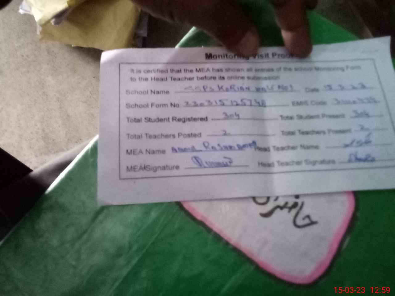 | Attendance Register | Head Teacher | MEA with School | Visit Proof |