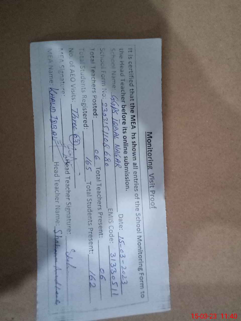| Attendance Register | Head Teacher | MEA with School | Visit Proof |