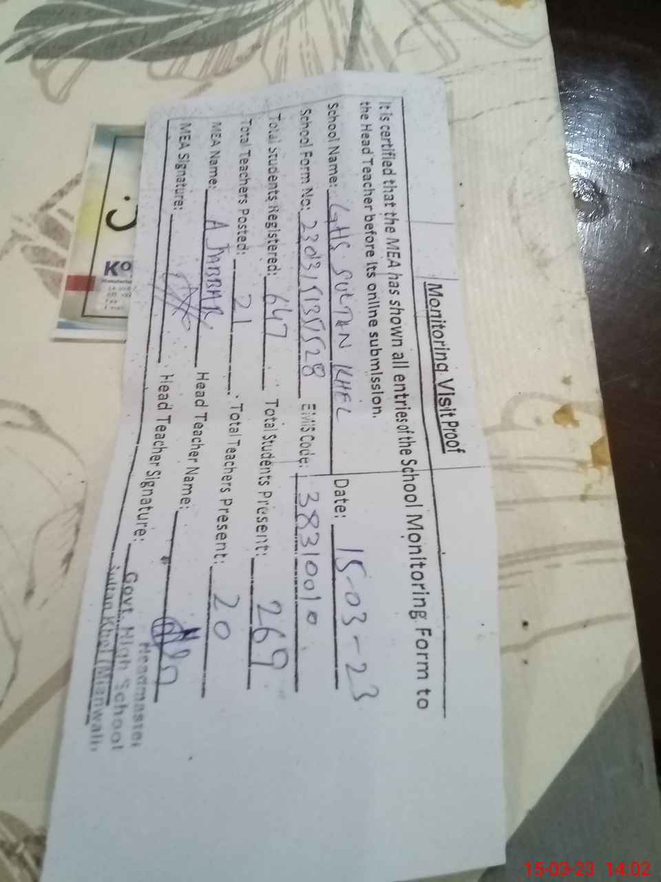 | Attendance Register | Head Teacher | MEA with School | Visit Proof |