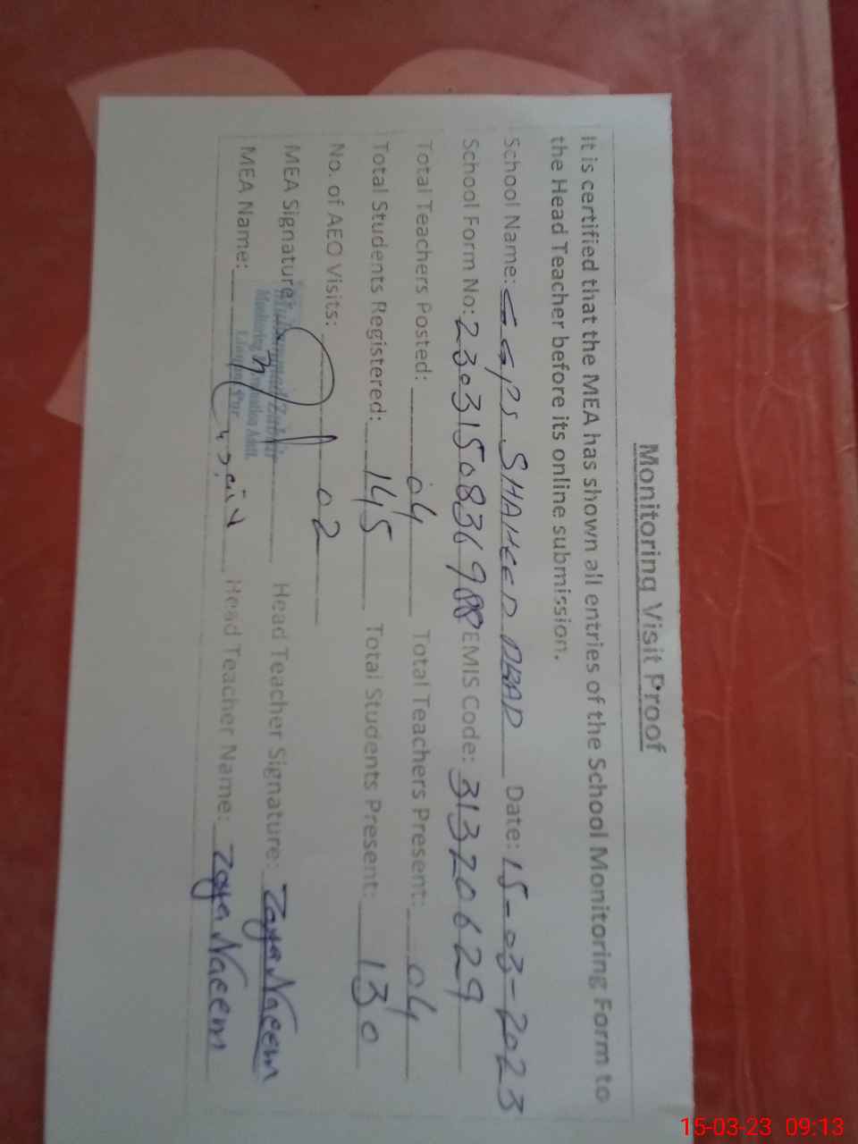 | Attendance Register | Head Teacher | MEA with School | Visit Proof |