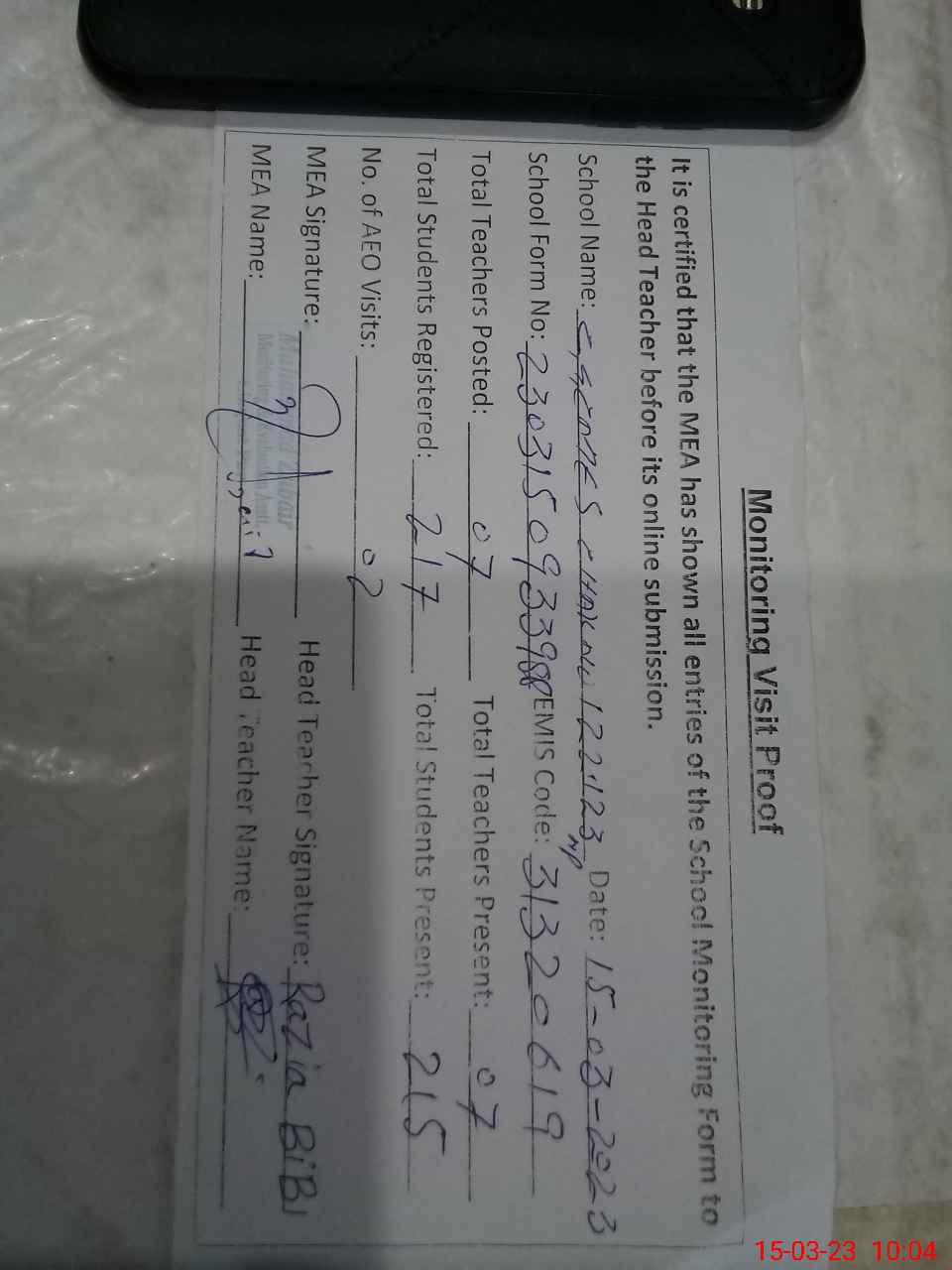 | Attendance Register | Head Teacher | MEA with School | Visit Proof |