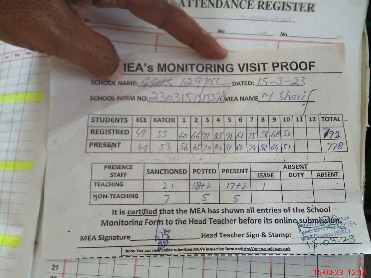 | Attendance Register | Head Teacher | MEA with School | Visit Proof |