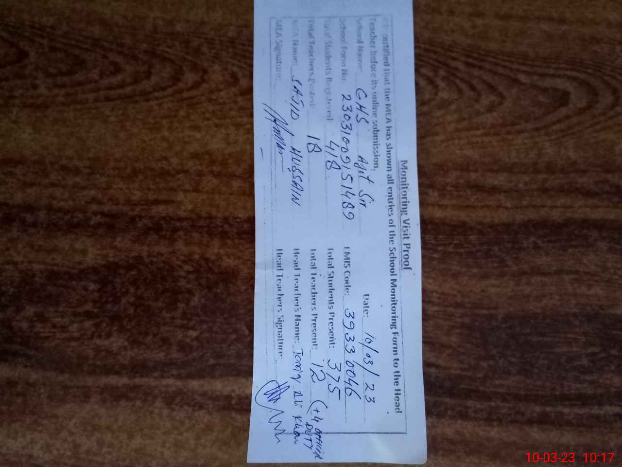 | Attendance Register | Head Teacher | MEA with School | Visit Proof |