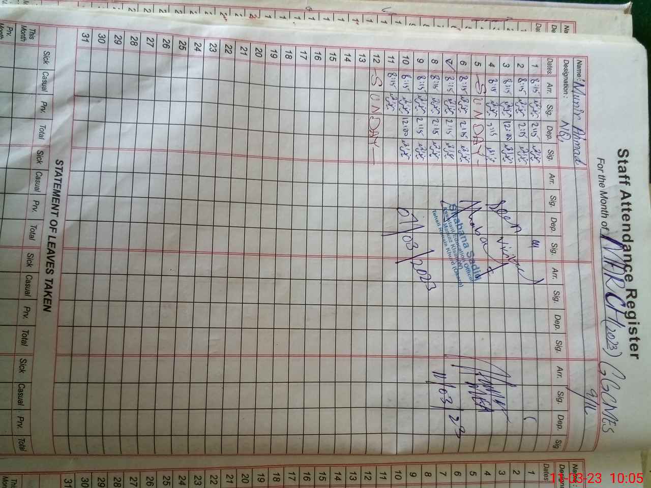 | CNIC | Full Name | Designation | R/C | Absence During Last Calender Month |
