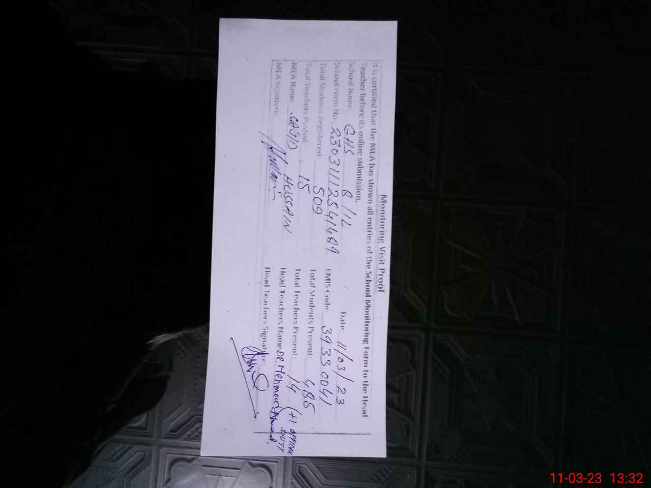 | Attendance Register | Head Teacher | MEA with School | Visit Proof |