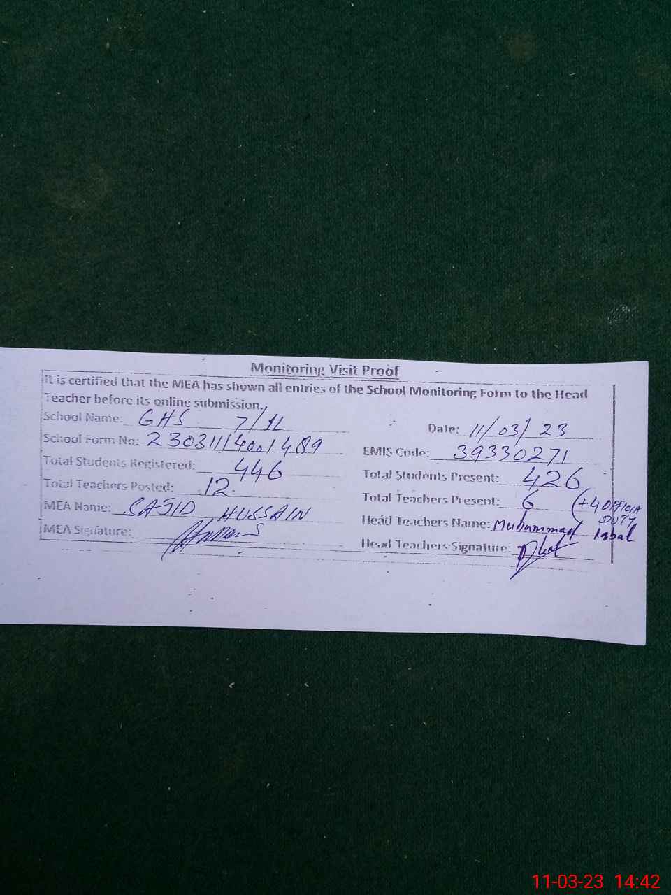 | EMIS Code: 39330271 | Name of School: GHS CHAK NO 7/1.L | |||