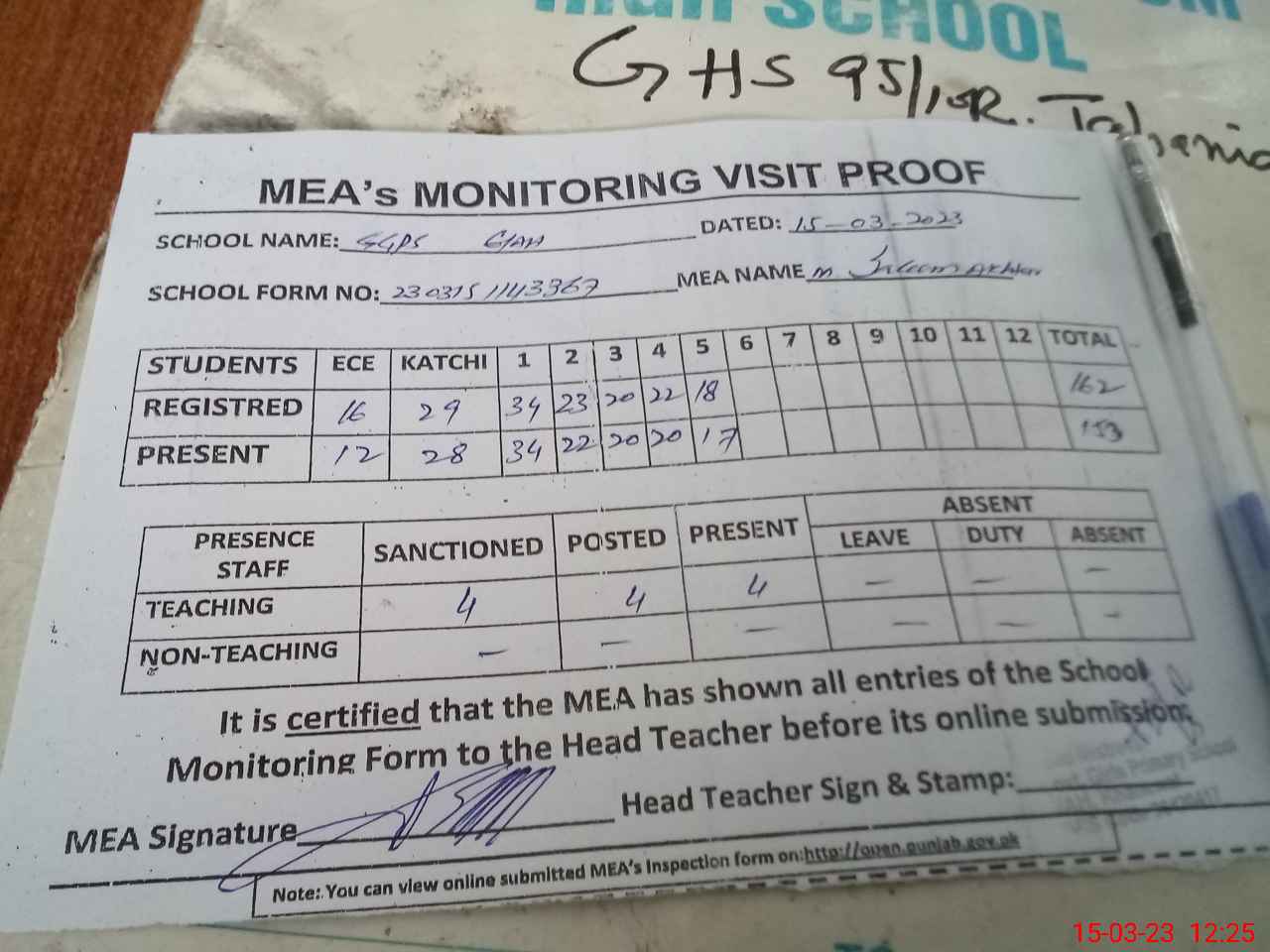 | Attendance Register | Head Teacher | MEA with School | Visit Proof |