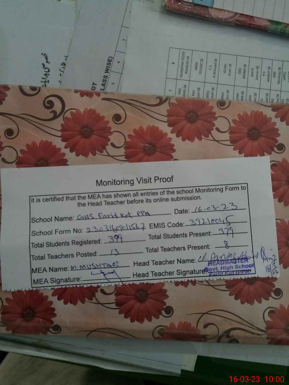 | EMIS Code: 39210045 | Name of School: GHS FARID KOT P/O PAKPATTAN | |||