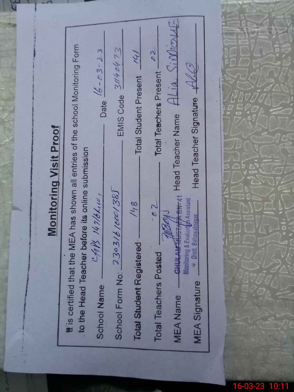 | Attendance Register | Head Teacher | MEA with School | Visit Proof |