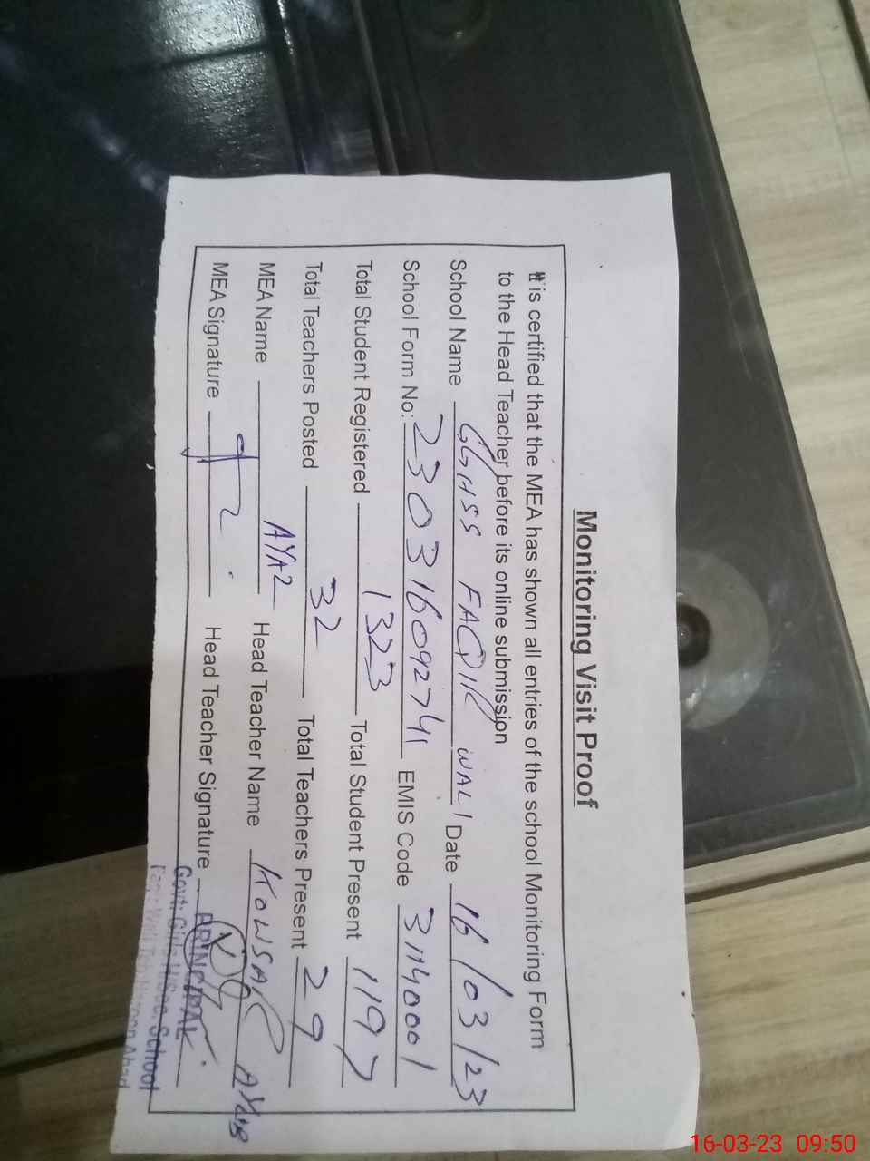 | Attendance Register | Head Teacher | MEA with School | Visit Proof |